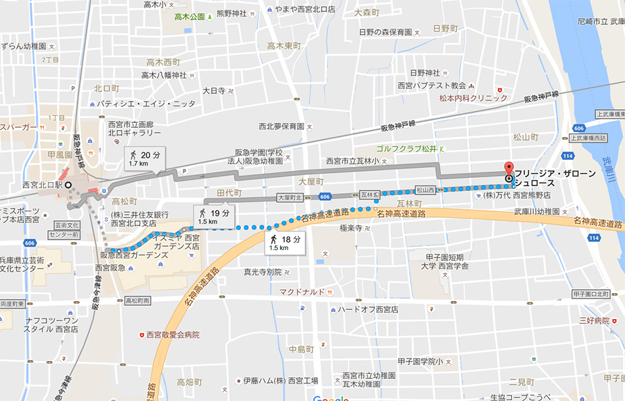 路線図(最寄り駅 JR甲子園口並びに阪急神戸線・西宮北口駅駅出口から徒歩20分)